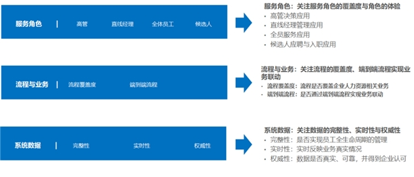 01、第一个维度是服务角色。人力资源系统要走出人力资源部,调研系统是不是更好地服务了高管、部门经理、员工,包括企业的候选人,他们对系统的一个覆盖以及相应的体验。