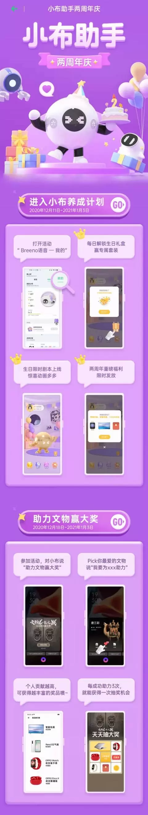 截至发稿,小布助手两周年生日会活动正在火热进行中,生日会包括小布养成计划、为文物打榜活动、冬至-疫尽春归H5的多个主题趣味玩法。现在参与生日会(参与范围:小布助手客户端版本5.12.0至6.0.0或7.3.0以上),还有机会获得OPPO智能电视R1 55寸、OPPO Watch ECG版智能手表、Kindle等丰厚奖品。