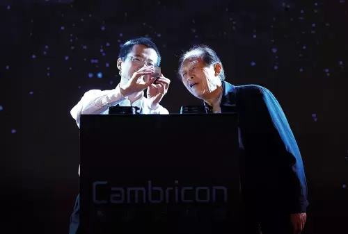 2018年5月3日,在上海国际会议中心举行的发布会上,寒武纪科技公司首席执行官陈天石(左)和他的老师、中科院院士陈国良一起发布芯片。当日,中国科学院发布国内首款云端人工智能芯片,理论峰值速度达每秒128万亿次定点运算,达到世界先进水平。图/视觉中国