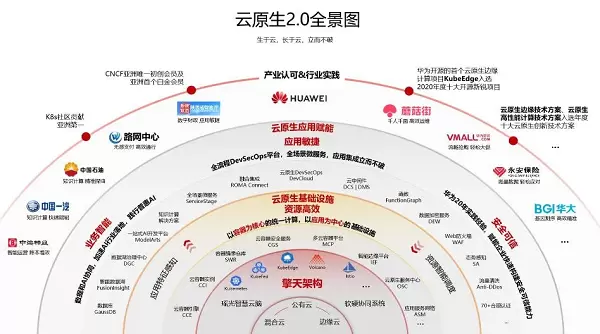 华为云还发布云原生2.0全景图,其中,应用敏捷层将云原生的全栈能力赋能给客户,帮助客户应用敏捷、业务智能,安全可信,面向未来持续演进。