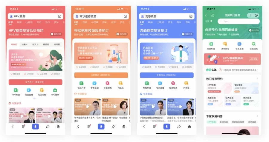 今年以来,百度健康还构建了从知识科普到在线问诊,从线上疫苗预约到线下医院接种的一站式闭环服务。围绕HPV疫苗知识获取需求,用户可以快速获取由权威专家提供的图文、直播、视频等形式的健康科普知识,还可直接通过疫苗预约页面在线问诊,与公立医院医生一对一沟通咨询,充分了解不同类型疫苗的适用范围,实现知识科普、疫苗问诊、线下接种的全流程健康管理服务。