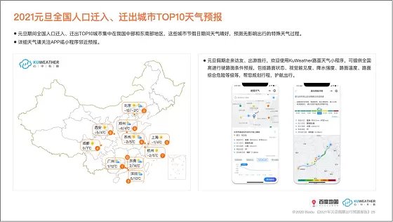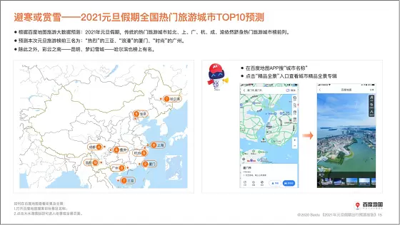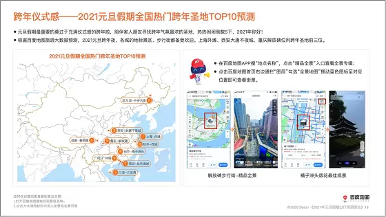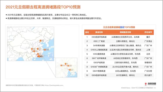 历经疫情洗礼的2020已进入倒计时阶段,2021即将满载憧憬到来。为迎接新的一年,百度地图联合交通运输部科学研究院综合交通大数据应用技术重点实验室、KuWeather共同撰写并发布《2021元旦假期出行预测报告》(以下简称《报告》),从人口迁徙、交通拥堵、热门景点、天气状况等多个维度预测元旦“出行热”,为用户提供出行参考。即将到来的元旦假期为2021年1月1日至3日,据《报告》显示,12月31日和1月3日将迎来人口迁徙和高速拥堵高峰,避寒“圣地”三亚、厦门、广州将迎来游客热潮,上海、西安、重庆等地热门商圈的跨年钟声将在万众瞩目中敲响。
