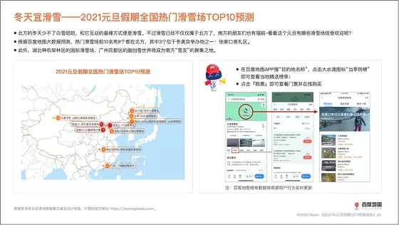 除赏景度假外,滑雪也是冬季游玩的必备项目之一。虽然80%的热门滑雪场都在北方,但湖北神农架林区的国际滑雪场、广州花都区的融创雪世界等知名雪场,也将为南方“雪友”打开冰雪世界的大门。用户只需打开百度地图APP搜索目的地,即可了解雪场详情并在线购票。
