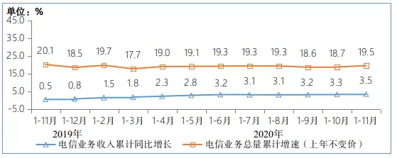 图2019-2020年1-11月电信业务收入和电信业务总量累计增速