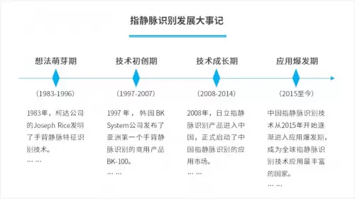 笔者总结,指静脉识别技术的发展可分为想法萌芽期(1983-1996年)、技术初创期(1997-2007年)、技术成长期(2008-2014年)、应用爆发期(2015年至今)4个阶段。