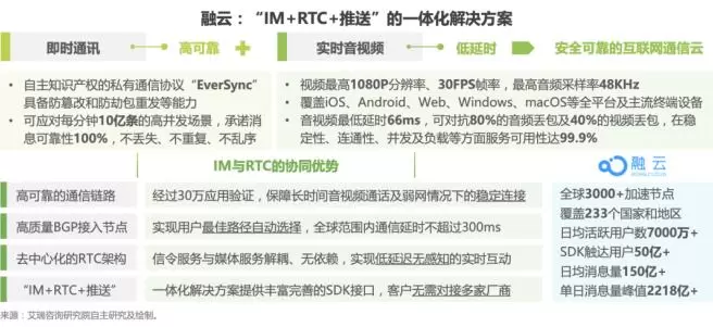 报告中,艾瑞以头部厂商融云为例进行了分析,称其拥有完整“IM+RTC+Push”的一体化解决方案,一套SDK便可解决所有通信问题,聚焦当下的互联网通信云市场竞争格局来看,融云凭借其技术实力在IM领域仍旧稳居第一阵列,在实时音视频市场也逐渐占据优势。