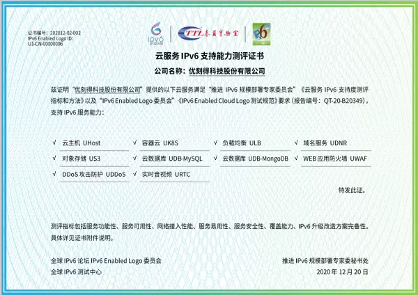 12月22日,由下一代互联网国家工程中心主办的“GNTC 2020全球网络技术大会”隆重举行。会上,优刻得凭借在云服务IPv6支持能力测评中优异的表现,一举夺得由主办方颁发的“云服务IPv6支持能力测评证书”,并荣获“IPv6支持度优秀奖”。充分肯定了优刻得在应用服务、应用基础设施、网络设备等开展IPv6升级和改造,推动IPv6互联互通、提升IPv6流量的技术能力。