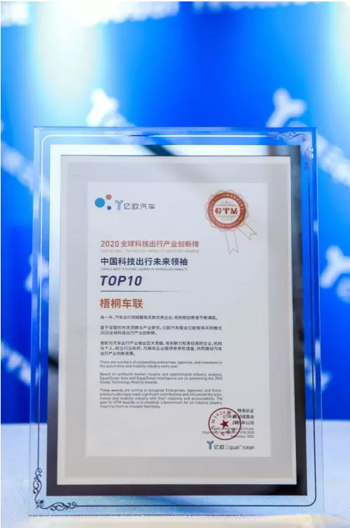 (11月27日,梧桐车联荣获亿欧汽车“2020中国科技出行未来领袖Top10”奖项)