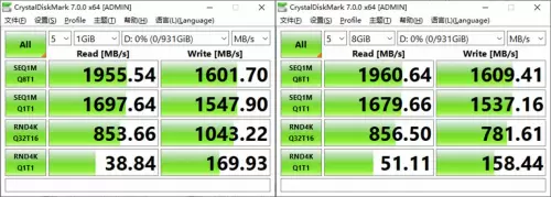 在性能表现上,通过CrystalDiskMark软件对两款固态硬盘进行测试,在连续读写方面,不论是1GiB还是8GiB文件测试,K550都能可以达到1950/160 MB/s以上的传输速度。