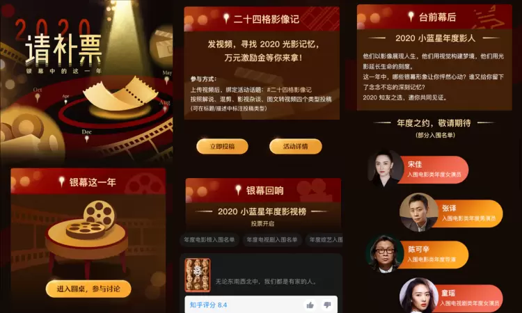 同时,知乎全面开启“2020请补票”活动,邀请网友通过“银幕这一年”圆桌讨论、“二十四格影像记”视频创作、“荧幕回响”及“台前幕后”四种方式,对2020年电影、电视剧、综艺发展脉络进行回顾梳理。