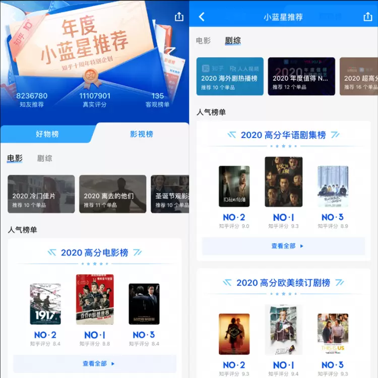 新鲜出炉的“2020小蓝星影视榜”分为电影与剧综两部分,基于用户的真实评分和讨论数据,根据不同类型、语种、热度,划分出28个细分子榜单,对2020年国内外电影、电视剧、综艺进行盘点与评分,为广大网友提供可信赖的影视参考。