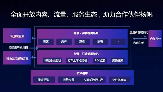 据了解,百度地图的全景发展构想坚守To B和To C两条路线,致力于整合细分垂类场景中的数据和服务,提供场景化服务。其中,面向B端伙伴提供基于百度地图全景的VR营销解决方案,同时也将合作伙伴的数据与服务反哺回百度地图,进而整合各个垂类的数据,不断完善不同场景中的服务。百度地图也面向合作伙伴开放私域流量运营能力的支持,共同完善B端行业营销解决方案。面向C端大众用户,百度地图则提供产品价值,包括街景时光机、街景留言等深受广大用户喜爱的产品功能。