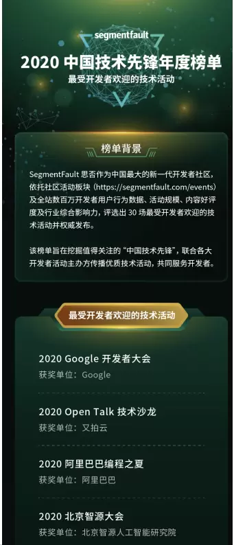 SegmentFault 思否作为中国领先的新一代开发者社区,依托社区活动板块及全站数百万开发者用户行为数据,及活动规模、内容好评度、行业综合影响力指标,评选出 30 场最受开发者欢迎的技术活动并权威发布。