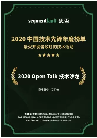 本次入选 2020 中国最受开发者欢迎的技术活动榜单,是广大开发者对又拍云 Open Talk 的认可,又拍云将继续举办更好的技术活动,创新活动形式,分享更多优质技术干货。