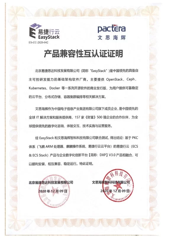 - 文思海辉智翼云与易捷行云新一代私有云完成产品兼容互认证