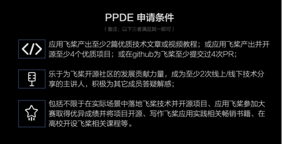 百度PPDE计划秉持开放理念,面向所有开发者敞开大门,只要对开源有热情并愿意为之分享和付出,满足以下三个申请条件其中之一,便可登录PPDE官网申请加入。