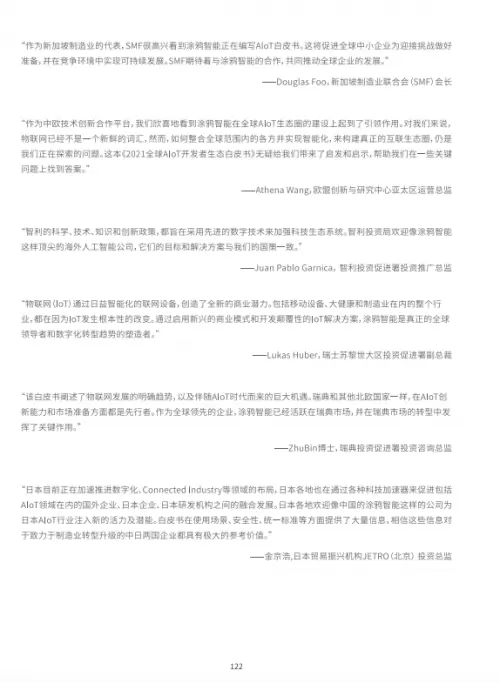 《2021全球AIoT开发者生态白皮书》在瑞典投资署、AWS、飞利浦、深圳安防协会、中国照明电器协会、中国智能家居产业联盟、百色鸟、觅睿科技、赛特维尔和鸿世电器的见证下,进行了中英双版全球首发。白皮书对行业的分析和未来趋势的判断,将为AIoT行业开发者带来极大的参考价值。详细了解可点击下载链接:https://promotion.tuya.com/event/AIoTebook