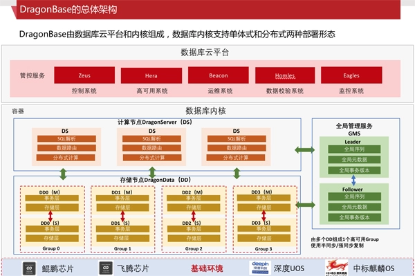 余邵在讲到,DragonBase总体架构主要由数据库云平台和内核组成。其中,云平台可以提供数据库的资源调度、故障切换、监控运维、数据校验等能力,并采用容器来部署数据库内核,实现多租户、资源隔离和弹性扩展等功能;数据库内核支持单体式和分布式两种部署形态,采用Share-Nothing架构,能够实现性能和容量的水平扩展,支持Hash、Range、List等分片方式。目前,DragonBase除了能支持X86平台,像主流的ARM平台等也能实现很好地支持。