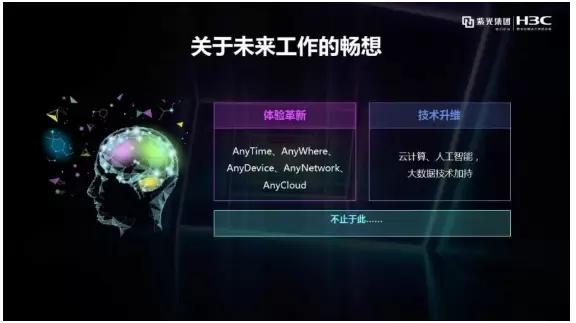 未来,新华三集团将持续发挥自身在云计算、大数据、人工智能等领域的优势,以“AI in ALL”智能战略和“数字大脑计划2020”的实践,与合作伙伴一起不断突破传统办公限制,为广大用户带来极致简单、极致高效、极致安全的“无界”工作体验。