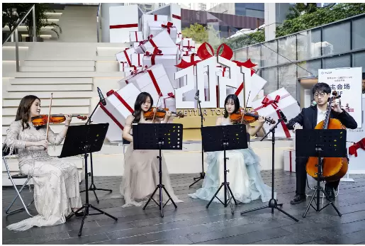 午后时分,华为全球旗舰店•深圳万象天地外的阶梯前人头攒动,四位老师优雅入场,给来往游客带来了一场流连忘返的快闪演奏。一曲莫扎特的《G大调弦乐小夜曲》作为开场,轻快的旋律吸引来往游客纷纷聚集围观;转而动感又神秘的《自由探戈》奏响,现场观众仿佛置身舞台中央,跟随短促的律动,与探戈舞者一同迈出华丽高雅的舞步;紧接着再来经典探戈名曲《一步之遥》,又宛如诉说着情人之间难以割舍的情愫。整个广场仿佛穿越了时空,众人来到了端庄高雅的古典音乐演奏会现场。演出完毕,现场游客纷纷表示意犹未尽,并对晚上的新年新愿•DIGIX Live音乐鉴赏会充满期待。