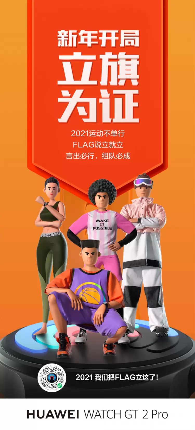 2021新年开局,我们把Flag立这儿了!如果你还在为新年Flag的内容而纠结,抑或是苦于每年Flag习惯性翻车,那就快拿起手机扫描海报上的程序码或在微信搜索“新年开局 立旗为证”进入小程序,召唤集美基友一起立下你们的新年运动Flag,在华为WATCH GT2 Pro智能手表陪伴与记录下,言出必行以更加健康的生活方式,迎接崭新的2021。