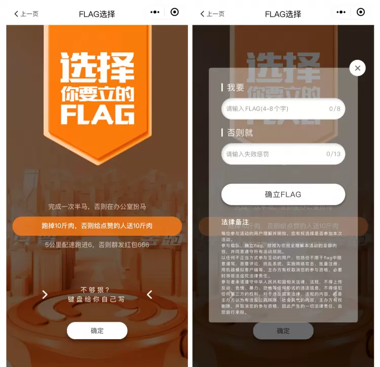 首先,只需在微信搜索“新年开局立旗为证”即可进入小程序,进入后可在足球、篮球、瑜伽、滑雪等多种运动状态中选择你所中意的运动方式,系统会在该运动模式之下生成不同的背景。在确定运动模式之后,便是选择Flag的阶段,除了系统自动给出的内容外,还可结合自身实际情况定制目标与惩罚,以更人性化的方式让你的新年运动Flag更具挑战性。