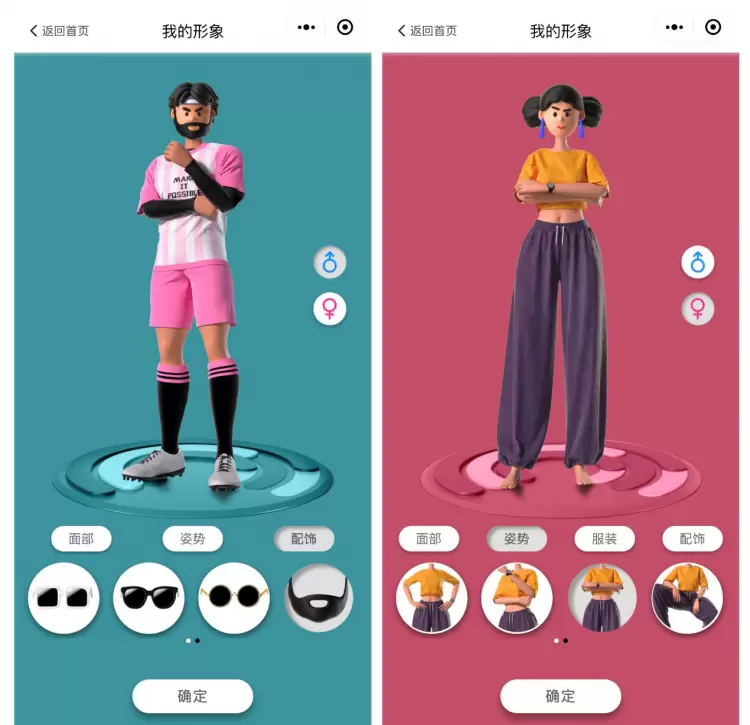 随后,便是万众期待的“捏脸”过程,作为展现自我个性的重要一步,在“新年开局 立旗为证”微信小程序中,可从面部、配饰、姿势、服装(部分运动支持)等四个方面对你的形象进行设定,不管是满脸络腮胡的大汉还是清新可人的萌妹纸,都能在这里找到与你相似的形象。