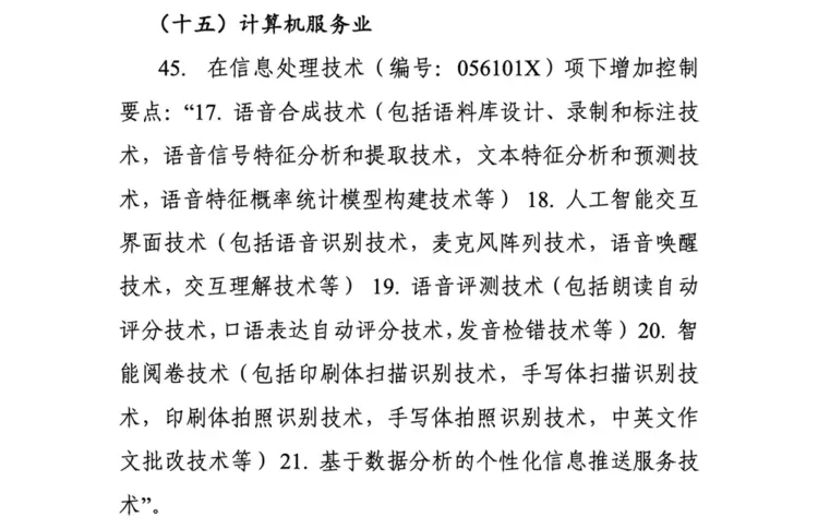 8月28日,中国商务部、科技部调整发布了最新版的《中国禁止出口限制出口技术目录》,新增语音合成技术、人工智能交互界面技术、语音评测技术、智能阅卷技术、基于数据分析的个性化信息推送服务技术等AI相关技术条款。