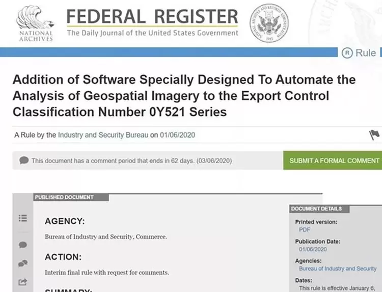 新规规定,从美国出口特定类型地理空间影像软件的公司必须申请许可,才能出口至海外。无论智能化传感器、无人机以及其他自动化设备的目标识别软件,都将受到管制。