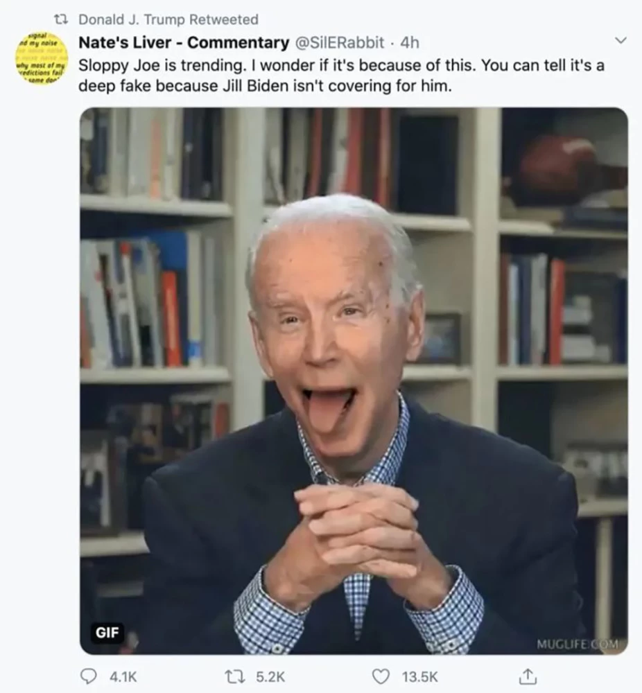 在今年美国大选期间,换脸技术还成了政客互相攻击的武器。比如特朗普今年4月在推特上转发了一个伪造拜登吐舌头的视频,当晚视频播放量超过1000万次。随后特朗普在5月又转发了用自己脸替换科幻电影《独立日》中总统托马斯·怀特摩尔、发表“我们要为我们的生存而战”演讲的视频。