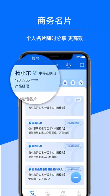 1、实名加V电话,即所有经过中国移动实名认证的号码都会被添加上“【V. 中国移动】”的认证标签。用户拨打加V电话,可以同时推送实名名片和个性签名给对方,更便于被叫一方了解来电者身份信息和通话意图。