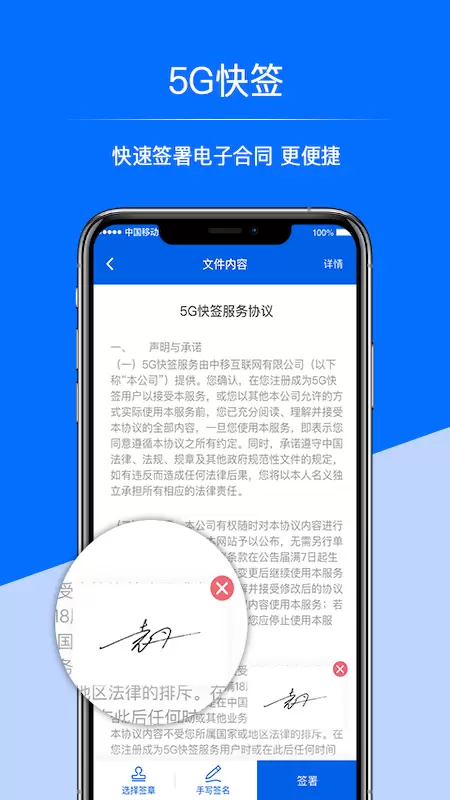 3、5G快签用于快速在线签署电子合同文件,这是具有法律效力的手机电子签章,从发起签署需求、签署文件到文件综合管理都实现全程电子化。