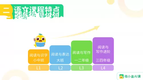 荷小鱼的课程设置追求严谨和科学。马芹老师介绍到荷小鱼的课程是依据【0-6岁语言敏感期发展理论】、《3-6岁儿童发展指南》和《2019部编版小学语文课程标准》进行编制的,并且按照用户的学习阶段和学龄特点,精准分层,打造了阶梯型的课程模块,能够帮助孩子进行科学的学习。