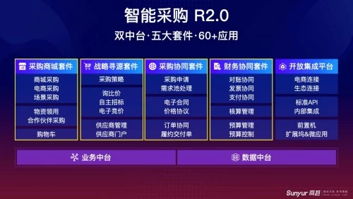 R2.0泰山版从“全链路、全品类、全场景、全采购组织模式”4大业务视角支持所有企业非生产采购;以2大中台既业务中台、数据中台,5大套件既商城采购套件、战略寻源套件、采购协同套件、财务协同套件、开放平台及60+应用的“全功能”满足企业需求。