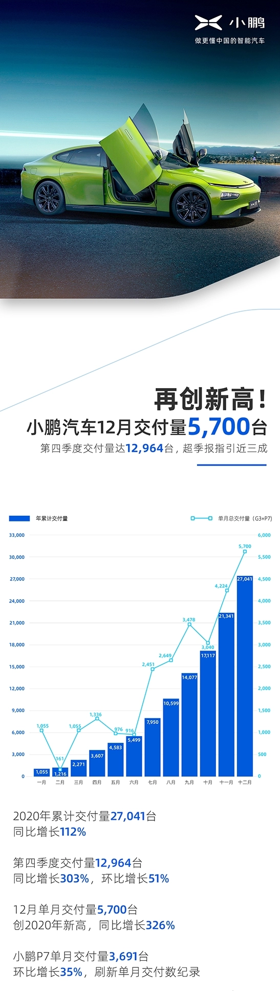 2020年第四季度累计交付12,964台,同比增长303%,环比增长51%。其中,小鹏P7累计交付8,527台,环比增长37%。2020年全年累计交付27,041台,同比增长112%。