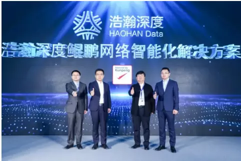 浩瀚深度董事长张跃(右二)、华为中国云与计算鲲鹏生态发展部部长李航(左二)、浩瀚深度总经理魏强(左一)、华为中国区移动系统部计算业务部部长倪雄(右一)共同发布浩瀚深度鲲鹏网络智能化解决方案