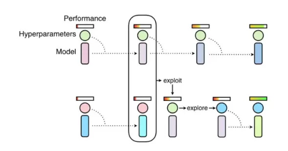 进化算法是一种基于种群概念的超参搜索策略,把超参配置视为一个种群,并行优化多个种群并在种群内部进行优胜劣汰的筛选,最终输出最佳模型。这个过程(如下图所示)是从遗传算法获得的灵感,种群的初始化采用随机的方式生成,个体的优胜劣汰具体指利用(exploit)和探索(explore)两个步骤,不仅可能会从表现较好的个体中复制参数,它还能通过随机扰动修正当前的值而探索新的超参数组合。