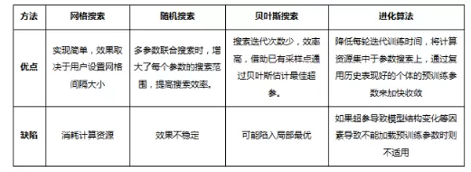 上表归纳了一下这些搜索方法的优缺点。总之,网格搜索和随机搜索实现上比较简单,不利用先验知识选择下一组超参数,其中随机搜索效率相对较高。贝叶斯搜索和进化算法需要用前一轮的信息进行迭代搜索,搜索效率明显提升。