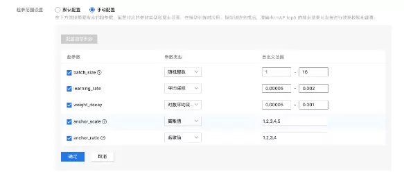 【超参范围设置】:可以是默认配置,也可以手动配置。默认的话百度的工程师们已经帮我们对不同网络、GPU卡型设置了一个基本靠谱的搜索范围,直接用就可以。当然也可以手动配置,可以自定义各个超参的范围,可以看到物体检测支持以下这些超参自定义搜索范围: