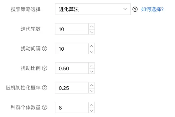 【种群个体数量】:一个个体代表一种超参数设置,一个种群中包含多个个体。其它选项和贝叶斯搜索的含义一致,也不重复了。进化算法的配置需要对算法的原理有一定的了解,如果对算法不明白的,就直接用百度给的默认值吧!