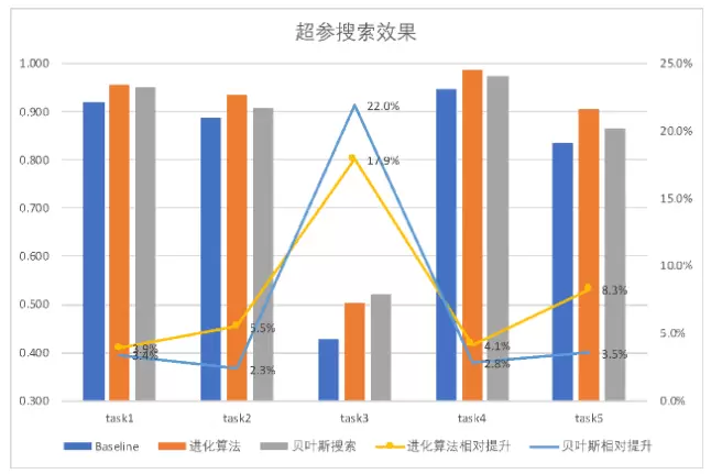 我们对比了图像分类、物体检测、实例分割等任务在使用普通脚本调参和超参搜索的效果情况,以下是5个不同数据集在BML平台上分别使用默认脚本调参参数、超参搜索使用进化算法、超参搜索使用贝叶斯搜索算法的效果对比。图中左边纵轴为模型的准确率,右边纵轴为超参搜索算法在效果上提升的比例。可以看到在不同数据集上使用超参搜索后效果均有提升,在默认参数精度已经超过85%的情况下,使用超参搜索仍能提升约5%,在默认参数效果较差的情况下,超参搜索的提升效果更为明显,可高达22%。