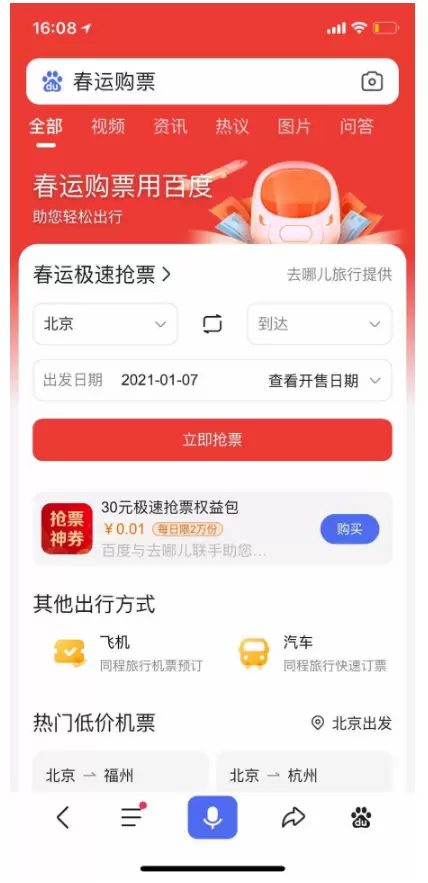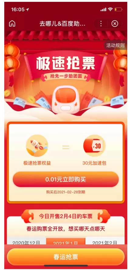 百度App上线春运抢票功能,1分钱换30元抢票加速券