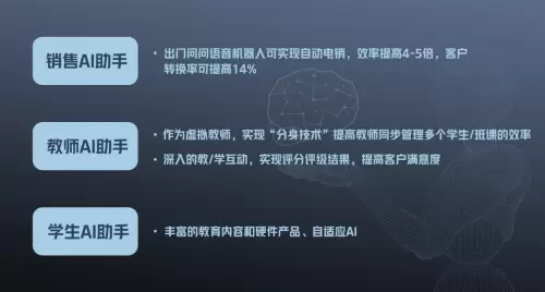 面向销售端,出门问问借助AI技术帮助在线教育公司培训电销人员,在提高培训效率的同时进行全量质检,及时发现销售/教师的不规范行为及用语。此外,AI在教育领域的应用,还能以智能电销的模式进行销售线索挖掘及分级,提高销售转换率,并通过实时坐席辅助的方式,帮助电销人员快速了解用户意图及合适的回复话术。