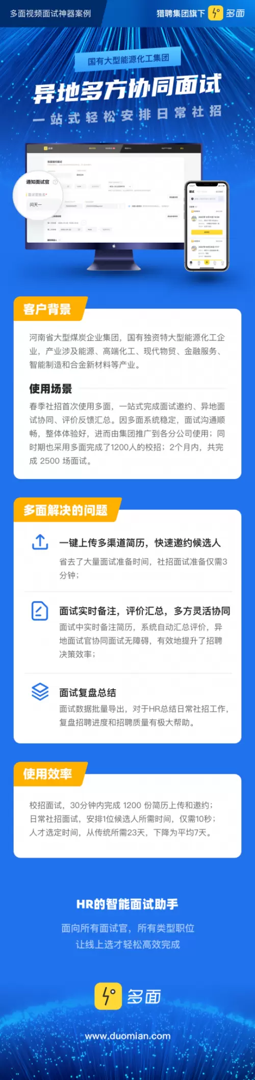 如河南省大型煤炭企业集团,是国有独资特大型能源化工企业,其产业涉及到能源、高端化工、现代物贸、金融服务、智能制造和合金新材料等产业。在一次春季社招时,就面临了应聘人数多、评价汇总和复盘总结难以整理等困扰。在使用了多面这款批量在线面试平台后,一站式完成了面试邀约、异地面试协同、评价反馈汇总等任务,可以说节省了不少宝贵时间。而且多面系统完善,操作时更加稳定,使这次面试的沟通非常顺畅,整体体验良好。据了解,在使用多面后,企业集团面试的整体效率显著提升,同时期可完成1200人的校招;两个月内,一共完成了2500场面试,可以说在效率上有了突飞猛进的态势。