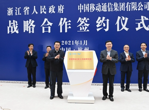 浙江省委书记袁家军和中国移动董事长杨杰共同为中国移动(浙江)创新研究院揭牌,浙江省长郑栅洁代表省政府与中国移动通签署战略合作协议。浙江省委常委、秘书长陈金彪,副省长高兴夫,中国移动副总经理高同庆出席签约仪式。