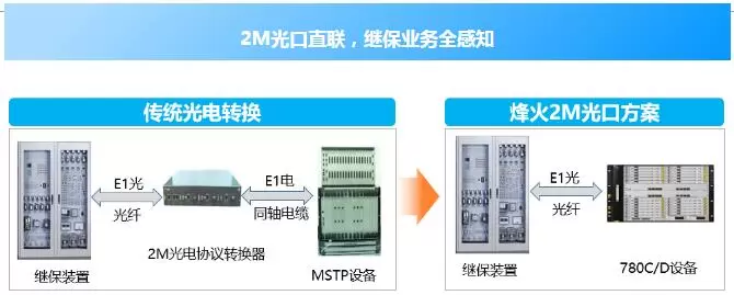 传统继保业务均通过2M光电协议转换器实现继保装置与各厂家的MSTP设备对接,这意味着继保业务的故障率会因2M光电协议转换器和多个光纤、光缆接口的引入成倍增加。而烽火通信基于FonsWeaver 780C/D设备提出的2M光口方案,通过设备板卡上的2M光接口盘,可实现继保装置和MSTP设备的直接互联,消除了2M光电协议转换器的安全隐患,从而减少了一级故障点;同时,也使得2M继保业务完全纳入了MSTP网管,提升了业务传输信号性能指标的实时监控和管理能力;此外,还能更简易的确定故障原因、快速定位故障点;而接线、布线的简化,也简化了施工,一定程度上节约了建网成本和后期运维成本。
