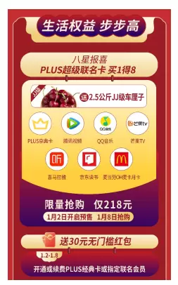 1月8日0点,京东限量推出“买1得8”的PLUS会员超级联名卡,开卡就送2.5公斤智利JJ级车厘子,还可享受包含PLUS京典卡、腾讯视频、QQ音乐、芒果TV、喜马拉雅、京东读书年卡及麦当劳OH麦卡月卡的多项权益。如果没抢上超级联名卡,不要紧,开通或续费PLUS京典卡或指定PLUS联名会员,还送30元无门槛红包。