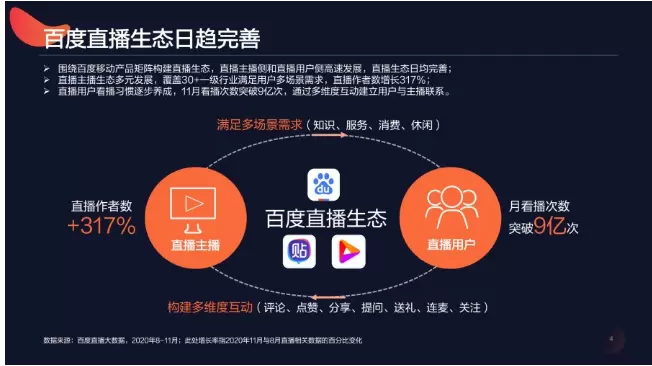 报告显示,围绕百度移动产品矩阵构建的直播生态一侧连接直播主播,一侧连接直播用户,通过主播生态多元发展满足用户在知识、服务、消费、休闲等多场景需求,通过多维度方式构建用户与主播联系,百度直播生态日趋完善。据统计,2020年11月,百度直播月看播量突破9亿次,与此同时,百度直播创作者数量增长317%,覆盖包括创作者、媒体、企业和机构等30多个一级行业主播,以百度App、百家号、好看视频、基木鱼等产品矩阵为核心的百度直播生态正迎来高速发展阶段。