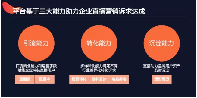 今年以来,企业线上化进程加速,直播深入到企业发展的各个环节,成为企业对内沟通的重要切入口。百度直播营销通过引流能力、转化能力和沉淀能力这三大能力,助力企业直播营销诉求达成。