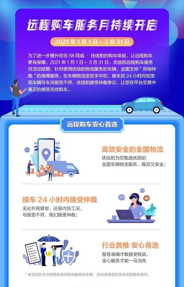 2020年11月,58同城优信拍进一步深化车商服务,推出"远程购车异地服务保障",这就意味着,优信拍全面开启对车辆的检测报告"负责到底"机制。远程异地买家无需来购车地检查车况,车辆交易将全流程接受争议与仲裁,若因运输导致车辆受损,物流公司也将第一时间进行赔付。多维措施减少了买家对远程购车的顾虑点,完善了二手车异地交易的最后一环。